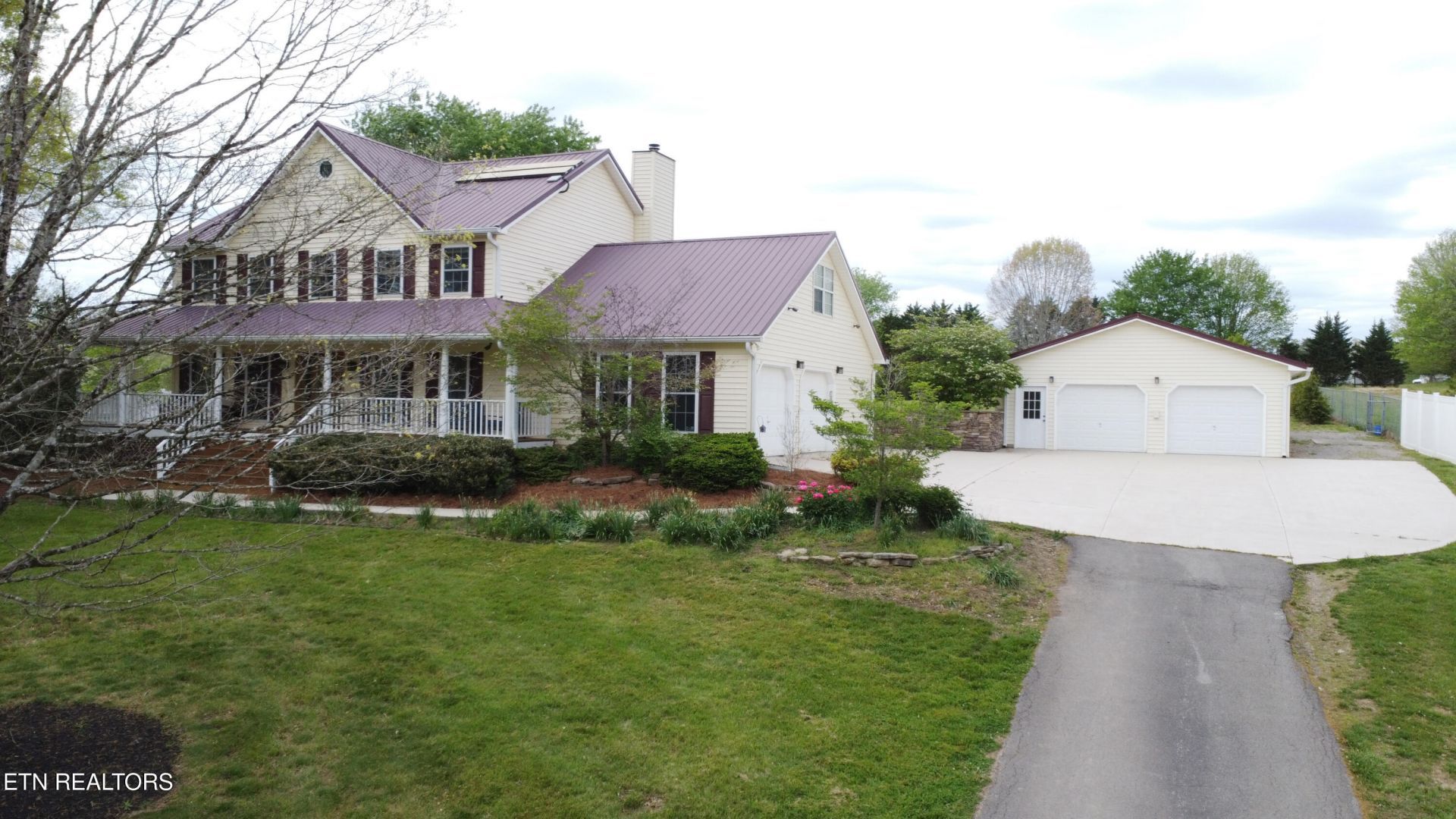 Welcome to your peaceful country escape just minutes from downtown Knoxville. Set atop a scenic hill on nearly 2 acres, this beautifully designed home offers the perfect balance of privacy, comfort, and exceptional indoor-outdoor living. From the moment you arrive, the professionally landscaped grounds and inviting wrap-around front porch create a warm first impression. This expansive porch is the perfect place to enjoy morning coffee, take in the sunrise, or unwind in the evening while overlooking the rolling hills. Inside, the home features a bright, open-concept layout filled with natural light. Large windows throughout the main level showcase the surrounding landscape, while the seamless flow between the living room, dining area, and kitchen makes it ideal for both everyday living and entertaining. A second living room with hardwood and tile floors and a cozy wood-burning fireplace offers a welcoming space for relaxing evenings, conversation, or movie nights. The spacious kitchen is designed with both function and style in mind, featuring a large island, ample counter space, and a generous pantry for storage. Just off the kitchen, a mudroom with a custom hall tree bench provides a convenient drop zone and leads to the attached two-car garage. The main level also includes a flexible bedroom, a full bathroom, and a versatile bonus room that can serve as a home office, gym, or entertainment space, with direct access to the pool area. Upstairs, the primary suite offers a private retreat with a luxurious en-suite bathroom complete with a walk-in shower, soaking tub, and plenty of space to unwind. Two additional bedrooms and a well-appointed guest bathroom provide comfort and convenience, while a large bonus room offers flexibility as a fifth bedroom, media room, or playroom. Step outside and discover a true backyard oasis. The fully fenced yard offers privacy and space to enjoy the outdoors, centered around a beautiful in-ground pool with plenty of room for lounging and entertaining. An outdoor kitchen makes hosting easy, while the fire pit provides the perfect gathering spot in the evenings. One of the most unique features of the property is the tranquil koi pond, complete with a covered seating area that offers a peaceful place to relax and enjoy the soothing sound of water. Thoughtful landscape lighting enhances the entire outdoor space, creating a stunning ambiance after sunset. Additional outdoor features include an outdoor shower, a dog kennel, and both an attached two-car garage and a detached two-car garage with workshop space, providing ample parking and storage. Located just a short drive from downtown Knoxville, you will enjoy easy access to Market Square, the University of Tennessee, Neyland Stadium, the Tennessee River, and a wide variety of dining, shopping, and entertainment options. Outdoor enthusiasts will appreciate the proximity to parks, hiking trails, and the Great Smoky Mountains National Park. With its spacious layout, resort-style amenities, and serene setting, this home offers a rare opportunity to enjoy the best of East Tennessee living.